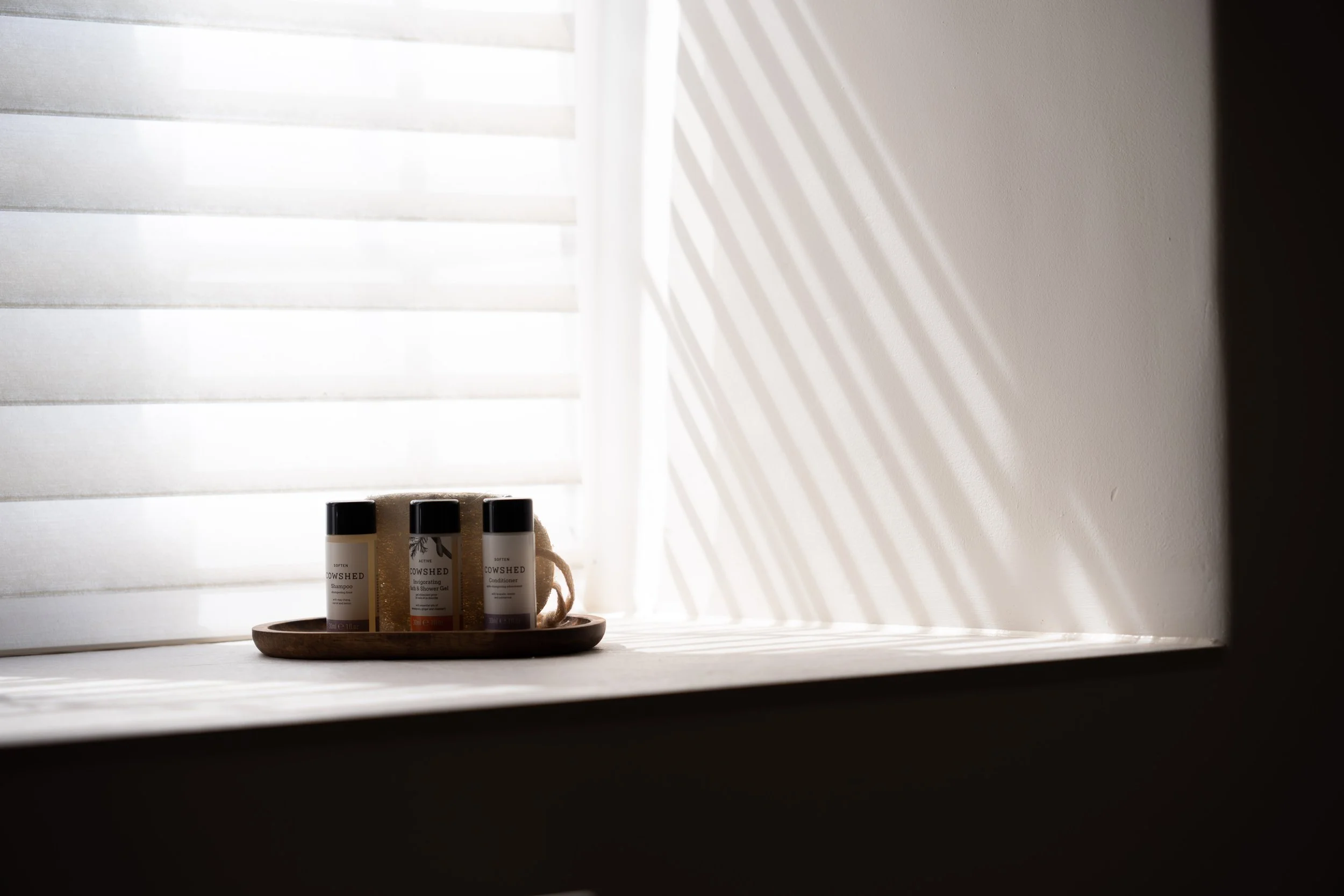 Crestron Horizontal sheer blinds are fitted in strategic rooms and bathrooms. These perform as privacy screening and filtered light into the room.