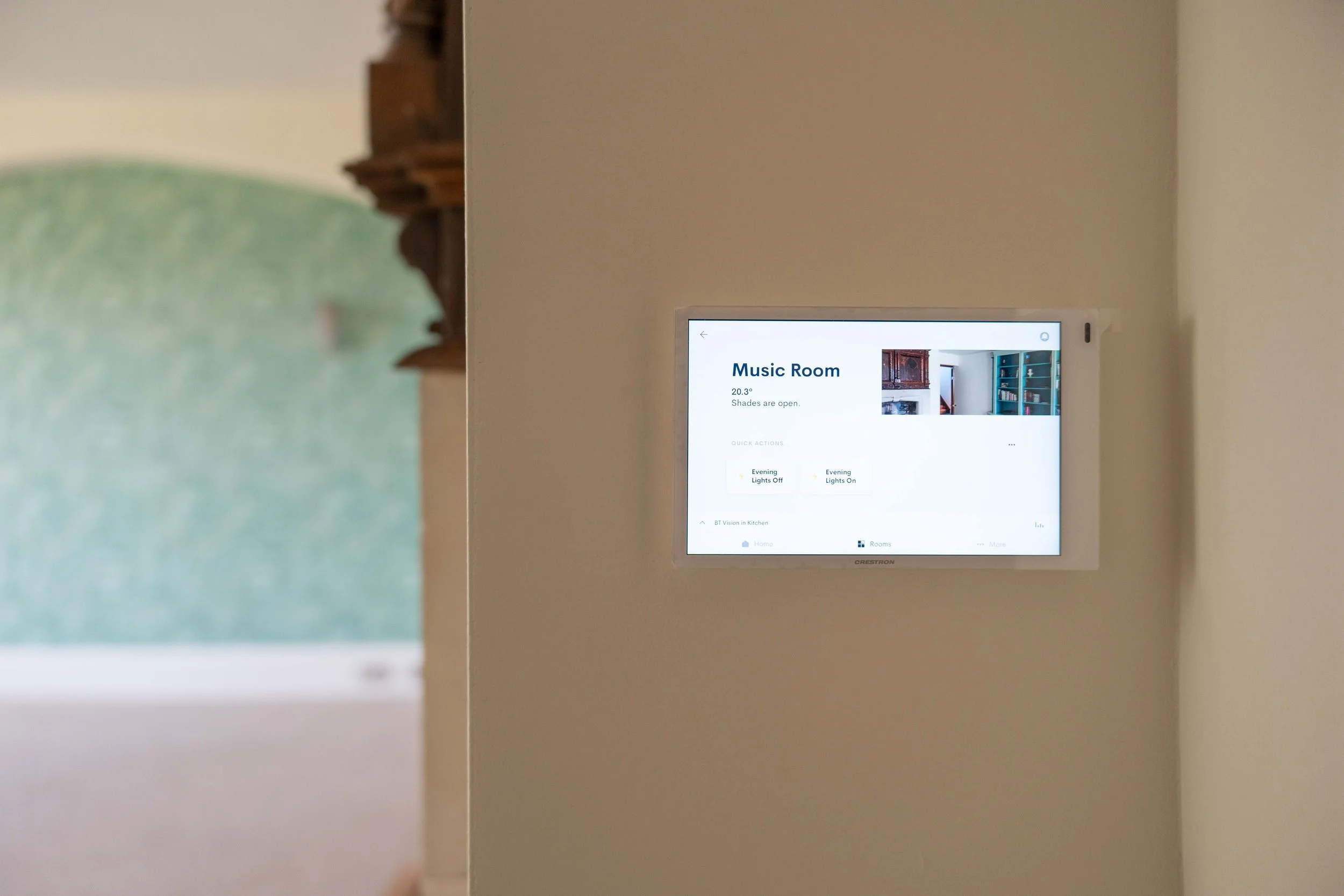 The house is under control of a Crestron Home system. Crestron Home was chosen for its simplicity and ability for us to remotely change any aspect as the clients need change. The consistent interface controls all the Audio, Video, Lighting, Heating, Security and Shading. Each room includes Crestron Keypads for simple lighting control and key rooms have 7" touch screens for more complex operations. Included is room to room intercom. The use of the Crestron Home app allows the client to adjust heating etc as they are heading back towards the home.